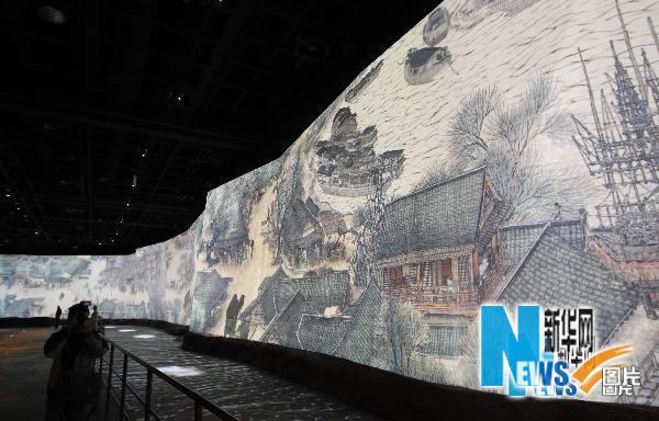 中国馆内的多媒体展项《清明上河图》正进行放映调试(4月17日摄)。裴鑫 摄