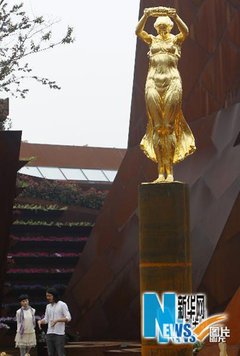 4月19日,两名工作人员正在卢森堡馆内展示的该国国宝——“金色少女像”下驻足。 裴鑫 摄