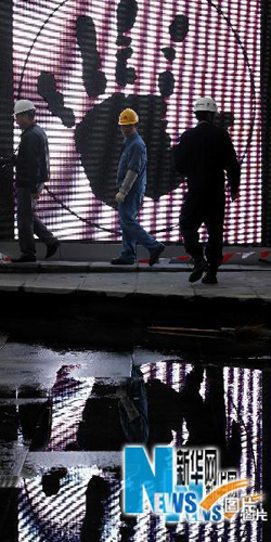 4月19日,几名工人从法国馆外的电子显示屏前经过。裴鑫 摄