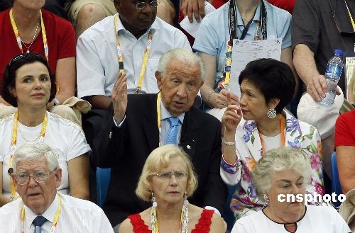 2008年8月23日,国际奥委会终身名誉主席萨马兰奇,来到北京“水立方”观看奥运会花样游泳集体项目决赛。中新社发 杜洋 摄