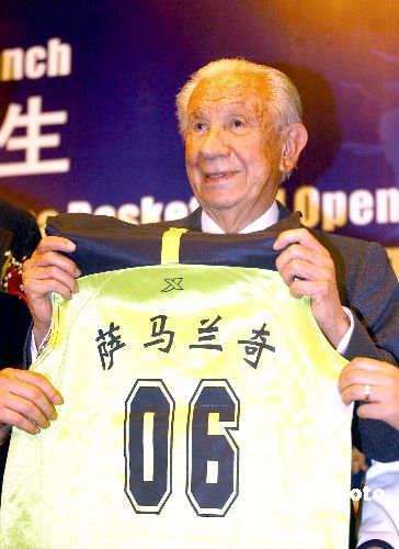 2006年3月24日,中国篮球协会、“贺龙杯”中国业余篮球公开赛组委会在北京正式聘请前国际奥委会主席、国际奥委会终身名誉主席萨马兰奇出任中国业余篮球公开赛顾问,并向萨马兰奇颁发由“寿山石”精心雕刻而成的聘书。图为萨马兰奇接受印有名字的中国业余篮球公开赛战袍。“贺龙杯”中国业余篮球公开赛自二零零五年十二月二十四日在北京开幕以来,已有北京、辽宁、甘肃、浙江、广东、安徽等赛区陆续开始了比赛。中新社发 盛佳鹏 摄