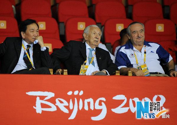 2008年8月13日,萨马兰奇(中)在工人体育馆观看北京奥运会拳击比赛的资料照片。图片来源:新华网