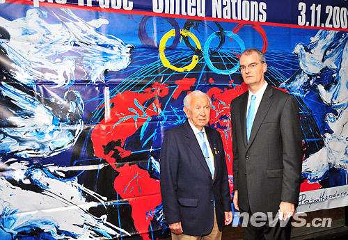 2008年8月10日,国际奥委会终身名誉主席胡安·安东尼奥·萨马兰奇在北京获得美国休战基金会颁发的特别奖项,该基金会称赞萨马兰奇推广“奥林匹克休战”理念,为世界和平做出了巨大贡献。这是国际奥委会终身名誉主席萨马兰奇(左)、美国休战基金会主席休·杜根在颁奖仪式上合影。图片来源:新华网 文涛 摄