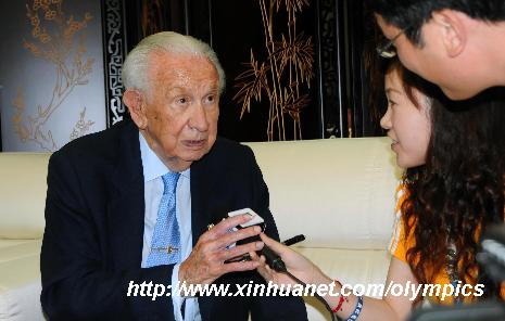 2008年9月9日,国际奥委会终身名誉主席萨马兰奇(左)在接受新华社记者专访时再次表示,北京奥运会是有史以来最好的一届。出色的筹备工作和中国军团的耀眼成绩,堪称本届奥运会的两大特色。图片来源:新华网 王岩 摄