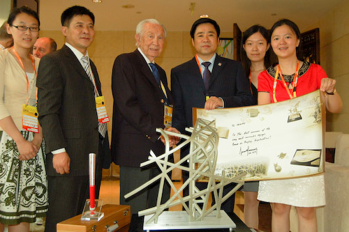 2008年08月17日,来京参加北京奥运会的国际奥委会终身名誉主席萨马兰奇老人接到了一份特殊的礼物——利用鸟巢剩余钢制作的鸟巢一榀钢雕。图片来源:北京奥运官方网站