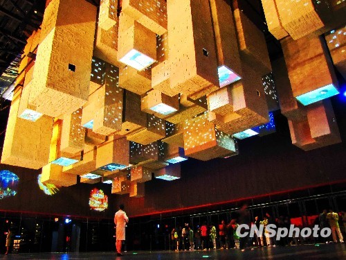 中国馆第49米层倒挂着一台台电视,里面播放的是全球各地普通人家的生活。 中新社发 井韦 摄