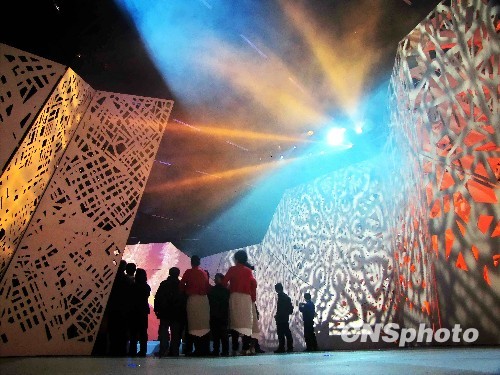 4月26日,上海世博园区波兰馆外型以民间剪纸艺术为主题外观,展馆通透、连贯的线条设计可谓融汇了传统与现代;镂空花纹的剪纸图案也为展馆内部营造出明暗对照的独特透光效果,使展馆呈现出不同的色彩。上海世博会期间,波兰馆将以独特魅力吸引世界各地的游客。中新社发 井韦 摄