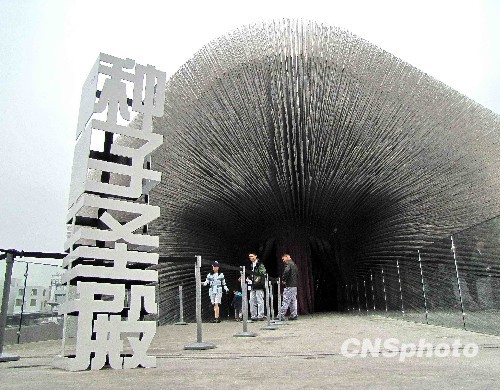 英国馆“种子殿堂”高20米,由6万根纤细的、蕴含植物种子的透明亚克力杆组成。 中新社发 井韦 摄