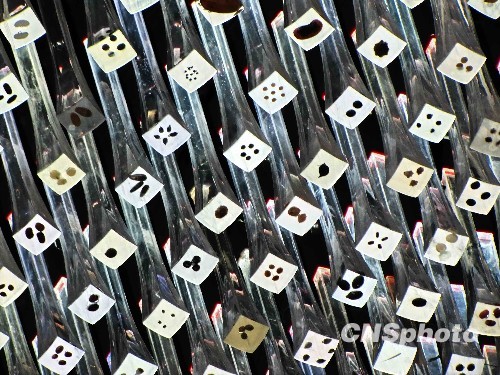被安放在英国馆亚克力杆里的种子。 中新社发 井韦 摄