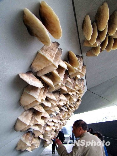 英国馆外墙上的奇怪“植物”吸引游客。 中新社发 井韦 摄