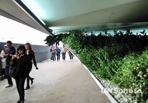 游客从英国馆内的绿色植被前走过。 中新社发 井韦 摄