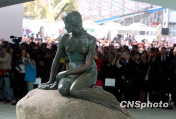 4月25日,上海世博园区丹麦馆举行小美人鱼雕像揭幕仪式,众多参观者慕名而来,一睹丹麦国宝的风采。当日,上海世博园区举行第5场试运行,共有40万参观者入园。 中新社发 汤彦俊 摄