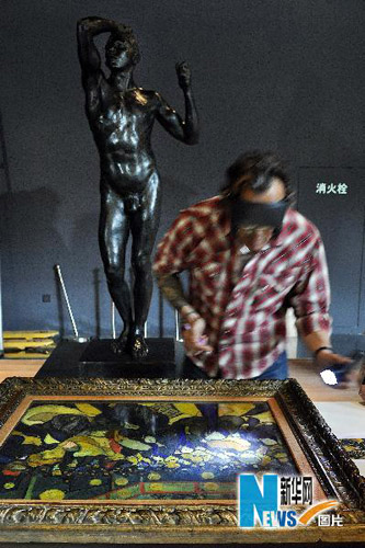 4月28日,法国奥赛博物馆的工作人员在检查刚刚运抵上海世博园法国馆的梵高的作品《阿尔的舞厅》,工作人员背后是法国雕塑家罗丹的《青铜时代》。(图片来源:新华网 张岩 摄)