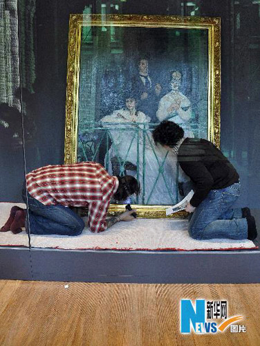 4月28日,法国奥赛博物馆的工作人员在检查刚刚运抵上海世博园法国馆的马奈的作品《阳台》。(图片来源:新华网 张岩 摄)