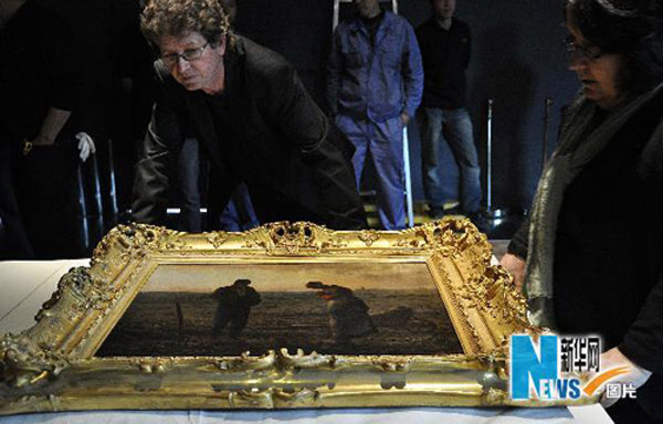 4月28日,法国奥赛博物馆的工作人员在检查刚刚运抵上海世博园法国馆的米勒的作品《晚钟》。(图片来源:新华网 张岩 摄)