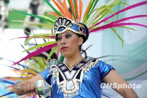 5月1日,上海世博会开园第一天,游客在美洲广场欣赏浓郁的墨西哥风情舞蹈。中新社发 陈文 摄