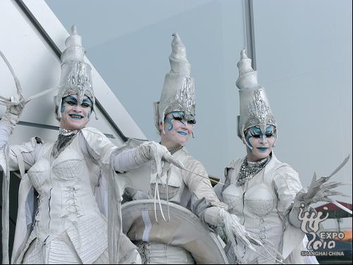 5月1日是上海世博会正式开园的第一天。一早,位于浦东世博园区的主题馆门口人头攒动,为排解众多参观者因长时间排队等候而可能产生的无趣乏味感,主题馆方面特别邀请了来自荷兰的“近距离剧团”,为排队参观者带来富有浓郁北欧风情的精彩演出。图片来源:世博网