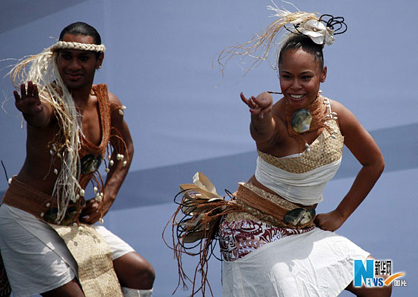 5月1日,演员在世博园大洋洲广场表演太平洋现代舞。太平洋现代舞热情洋溢,吸引不少观众驻足。当日,上海世博园正式开园。图片来源:新华网 王迎 摄