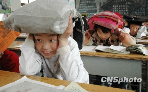5月12日,河南省温县番田镇杨垒小学学生在参加灾害逃生演练。当日是中国第二个“防灾减灾日”。该县组织6万名中小学生进行防火灾、地震逃生演练,观看安全教育专题片,以增强学生的安全逃生意识和避灾自救互救技能。中新社发 徐宏星 摄