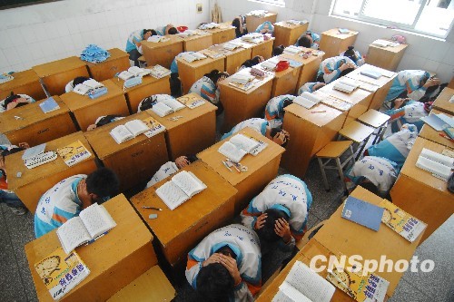 5月12日,江苏扬州市邗江美琪学校举行纪念“5.12”汶川地震两周年防震疏散演习。演习从下午2时28分开始,发出地震警报后,学校师生双手抱头就地紧急避险,30秒后,凄厉的警报声响彻校园,全校师生按照学校制定的疏散预案迅速撤离教学区。不到两分钟,全校2600多名师生员工就从6个楼梯通道全部撤离到安全地带。中新社发 陈中秋 摄