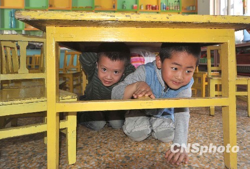 5月12日是四川汶川地震两周年纪念日,又是我国第二个“防灾减灾日”,山东潍坊曹家巷社区城建幼儿园的小朋友进行地震应急疏散演练。今年防灾减灾日的主题是“减灾从社区做起”。中新社发 王晓光 摄