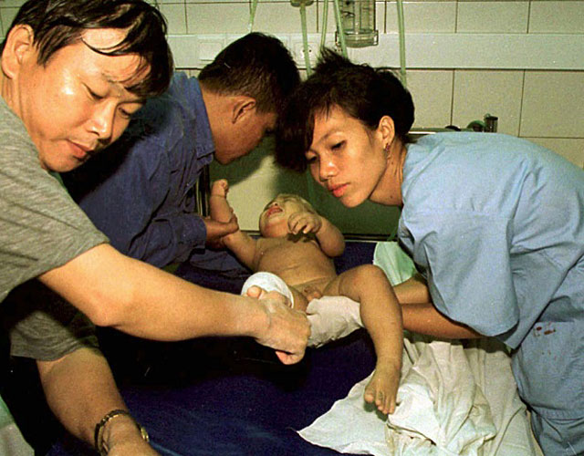 1997年9月3日,一架越南航空公司的俄制图波列夫客机,在从越南胡志明市飞往柬埔寨首都金边时坠毁。飞行员错误地在距离跑道几百米的地方着陆,导致机上65人死亡。当时唯一的幸存者是一名1岁男孩。图中金边医院的医生和护士们正在为这位唯一幸存者治疗。