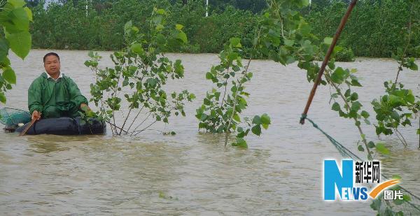 5月22日,江西上高县的农田因河水急涨大面积被淹,一名农民划着轮胎带着渔网在洪水中捕鱼。图片来源:新华网 陈芝华 摄