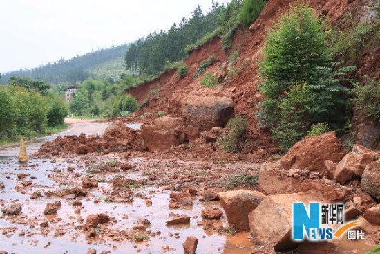 5月23日,江西赣县韩坊乡红星村因近期降雨发生山体滑坡,大量土石堆积在省道沙园线上。图片来源:新华网 朱建华 摄
