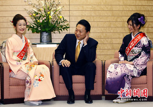 因美军在冲绳的普天间基地转移问题,日本首相鸠山由纪夫,2日早上在民主党参众议员大会中正式宣布辞去日本首相职务。图为2010年3月15日,日本首相鸠山由纪夫当日在东京首相官邸接见了2010年度“日本小姐”Mina Hayashi和“和服小姐”Aimi Azuma。