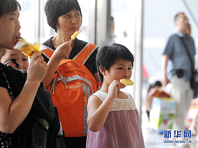 7月1日,几名参观世博园的游客吃冰棍降温。燕雁 摄