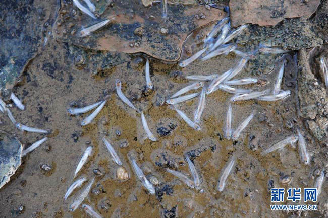 万泉河水位大幅下降,搁浅的小鱼在高温烈日下艰难求生(6月23日摄)。蒙钟德 摄