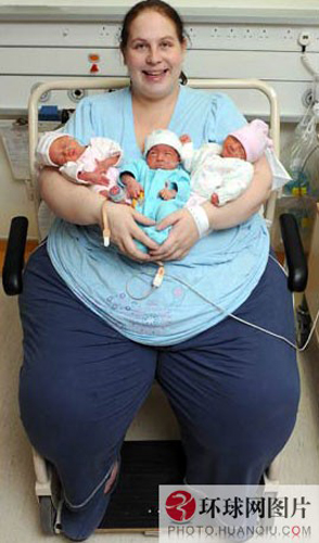 英国考文垂市肥胖女子丽恩-索特日前通过剖腹产手术生下了一组三胞胎,体重254公斤的她也因此成了世界上最肥胖的“三胞胎妈妈”。据悉,为了确保丽恩安全分娩,丽恩的剖腹产手术必须像军事行动一般精确,为此医院动用了4名外科大夫、4名麻醉师、5名助产士、12名新生儿顾问和护士共同帮丽恩接生下了她的奇迹三胞胎婴儿!