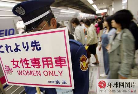 2005年5月,日本女性乘客在东京地铁站内搭乘贴有“女性专用车(WOMEN ONLY)”字条的专列上班。东京的地铁号称是世界上最拥挤最繁忙的地铁,人贴人的车厢为“咸猪手”们提供了最佳作案场所。这种“女性专列”最早是从2000年12月开始在新宿-多摩的地铁线路上设置的。试行后,这种“女性专列”颇受好评,2002年7月,地铁公司将“女性专用车”服务时间延伸到平常上班日的晨间。