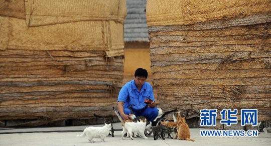 刘建国在粮仓附近喂食巡逻猫。姚剑锋 摄