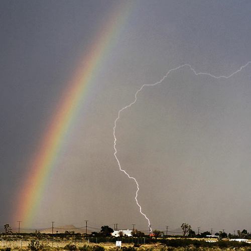 美国加利福尼亚州帕姆代尔市,闪电和彩虹同时出现在天空。