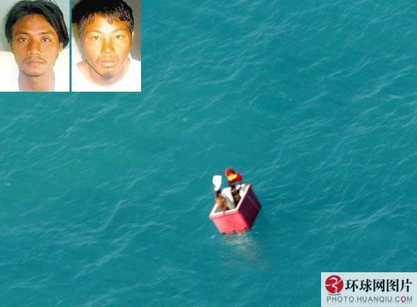 两名缅甸渔民就是这样在海上度过了25个日夜,从印尼外海一直漂到了澳大利亚附近的托雷斯海峡——直线距离超过5000海里。澳大利亚海防巡逻直升机在托雷斯海峡的霍恩岛以北60海里处,发现两名男子站在一个红色冷藏柜里,拼命向直升机挥手求救。这两名男子年龄分别为22岁和24岁,去年12月登上泰国渔船工作。他们告诉警察,他们和另外18名渔民乘坐一条大约10米长的木质渔船从泰国出海。在印尼外海上,这艘船突然开裂解体,转眼间就沉入了海水中。当船下沉时,获救的两名男子快速跳到船上一个1.5米长、1.2米宽的装冰块的大冷藏柜里。由于一开始根本不能动弹,他们只能眼睁睁看着其他人被淹死。