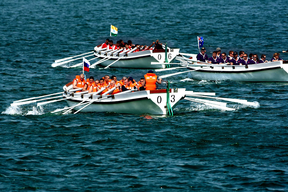 4月21日,为庆祝中国人民解放军海军成立60周年,来自法国、俄罗斯、韩国及东道主中国等12个国家的13支代表队在青岛举行舢板比赛。中新社发 宋吉河 摄