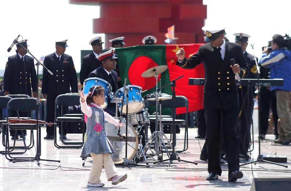 4月21日,孟家拉国海军军乐队和中国小女孩在庆祝中国海军60周年活动中表演。当日,来自美国、俄罗斯、韩国、印度、孟加拉国、巴西、中国等7国海军的8支军乐团在山东青岛联合举行以“欢乐海洋”为主题的多国海军军乐团联合演出活动,用不同风格的音乐架起友谊之桥。该活动为庆祝中国海军60周年纪念活动之一。 中新社发 郭国权 摄