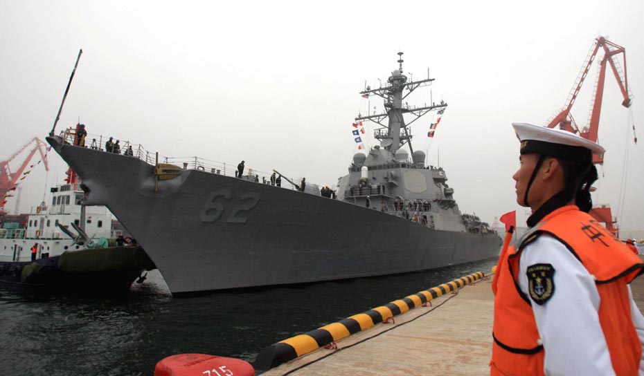 4月18-19日,来自14个国家的21艘舰艇先后抵达青岛港码头,参加海上阅兵。这是美国海军“菲茨杰拉德”号驱逐舰到港时情景。中新社发 张雷 摄