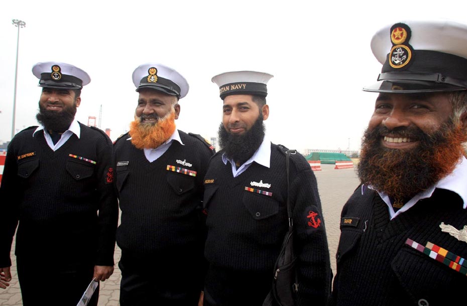 4月18日晚10时,参加多国海军活动的巴基斯坦舰艇“巴德尔”号驱逐舰、“纳赛尔”号补给舰抵达青岛。图为备受瞩目的巴基斯坦“大胡子”海军官兵。 中新社发 张雷 摄