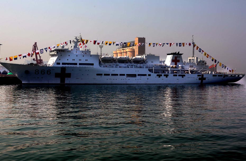 4月22日,停靠在青岛解放军海军码头参加庆祝中国人民解放军海军成立60周年多国海军活动的各国舰艇,各国海军官兵相互登舰参观,同时各国舰艇对青岛市民开放,让众多各界人士在参观中大开眼见。图为中国海军医疗舰艇。中新社发 宋吉河 摄