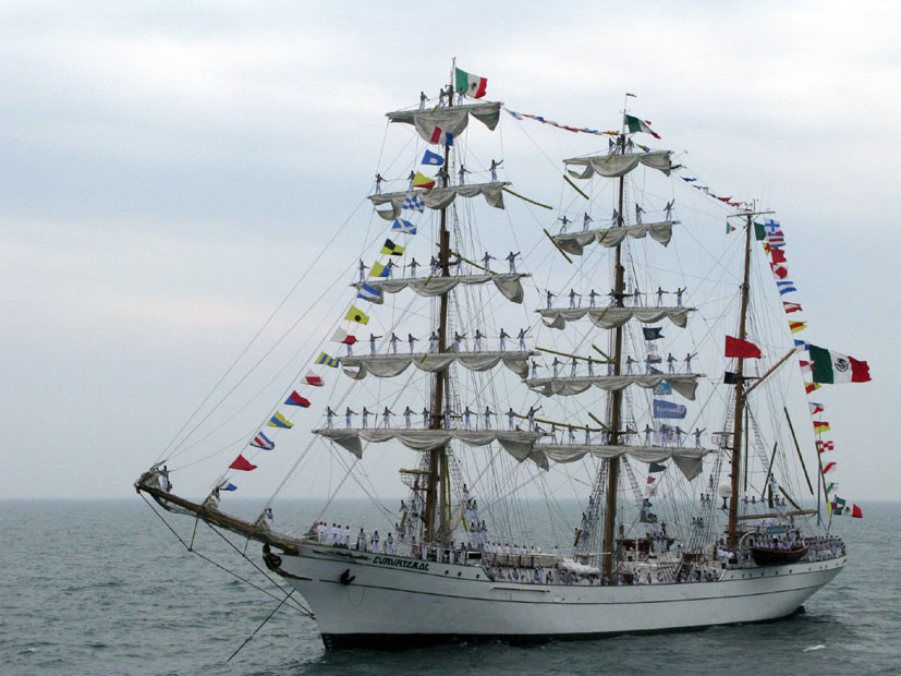 中国历史上的首次多国海军检阅活动四月二十三日下午在青岛附近黄海海域举行。中国国家主席、中央军委主席胡锦涛乘阅兵舰“石家庄”号导弹驱逐舰,检阅中国海军的潜艇、水面舰艇、海军航空兵和海军陆战队等作战兵种,并检阅了来访的十四个国家的二十一艘舰艇。图为墨西哥海军“夸乌特莫克”号风帆训练舰接受检阅。中新社发 中新社发 琥珀旺旺 摄