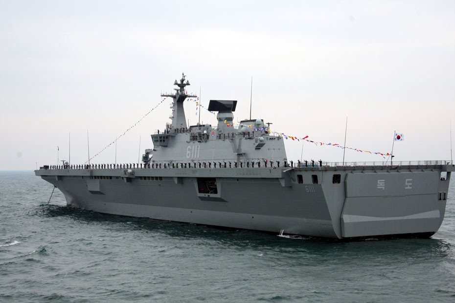 中国历史上的首次多国海军检阅活动四月二十三日下午在青岛附近黄海海域举行。中国国家主席、中央军委主席胡锦涛乘阅兵舰“石家庄”号导弹驱逐舰,检阅中国海军的潜艇、水面舰艇、海军航空兵和海军陆战队等作战兵种,并检阅了来访的十四个国家的二十一艘舰艇。图为韩国“独岛”号两栖攻击舰。中新社发 张雷 摄