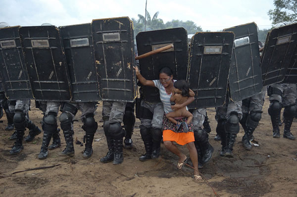 3月11日,在巴西马瑙斯市郊,一名“无土地农民运动组织”妇女试图反抗武装警察的驱逐。巴西无土地农民组织与警察发生冲突,反抗警方将他们驱逐出自己的住所。