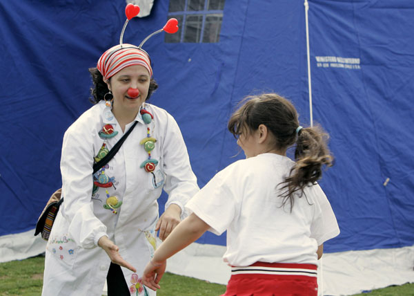 心理疏导志愿者在陪震区的孩子玩耍。截至4月9日,意大利中部地区地震已经造成包括16名儿童在内的272人丧生,另有千余人受伤,15人失踪。这次地震使2.8万人无家可归,受灾的民众在帐篷中组建起自己的临时家园。