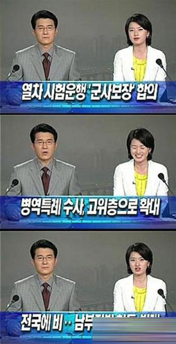 韩国一位美女主持在直播新闻过程中不知想起了什么高兴事儿,突然爆笑不止。你注意看旁边那位男主持:一脸无辜,还丈二和尚摸不着头脑呢。