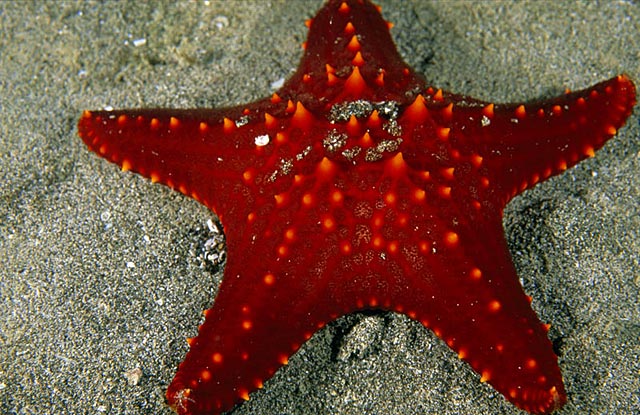 一只舒展的灿烂的红海星是加拉帕戈斯海岛海洋生物中漂亮的一景。海星不但可以再生失去的身体部分,而且它们还可以在受到攻击或者受到伤害的时候,自己切断肢体来逃生。