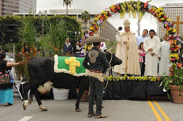 4月11日,在美国洛杉矶人们欢庆复活节的同时,也为他们的宠物举行了祝福仪式。这项祝福仪式每年举行一次,今年第一个被祝福的是农场里的动物。