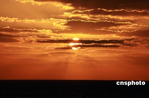 2009年3月10日,亚丁湾上,金光灿灿的晚霞。中新社发 孙自法 摄