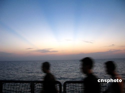 2009年3月29日,“海口”舰护航官兵,在亚丁湾晚霞之光中漫步 。中新社发 孙自法 摄
